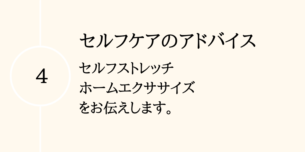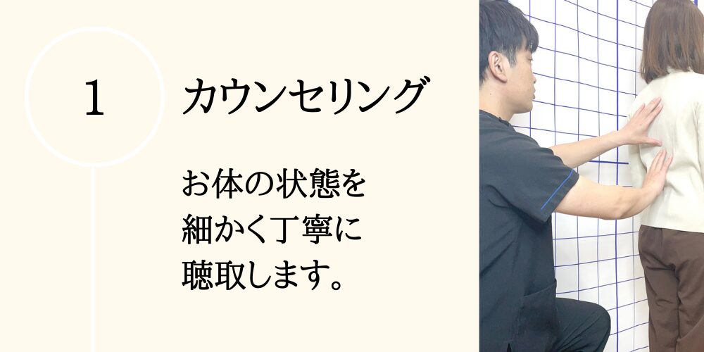 初回はカウンセリング(10~15分)から始まり、筋肉や関節の動きの状態を把握した上で、痛みや違和感などの不調に特化した施術をしています。