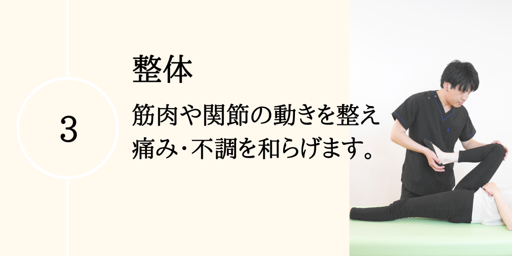 筋肉を柔らかくして、関節の動きを整え、痛み・不調を和らげることを目指します。