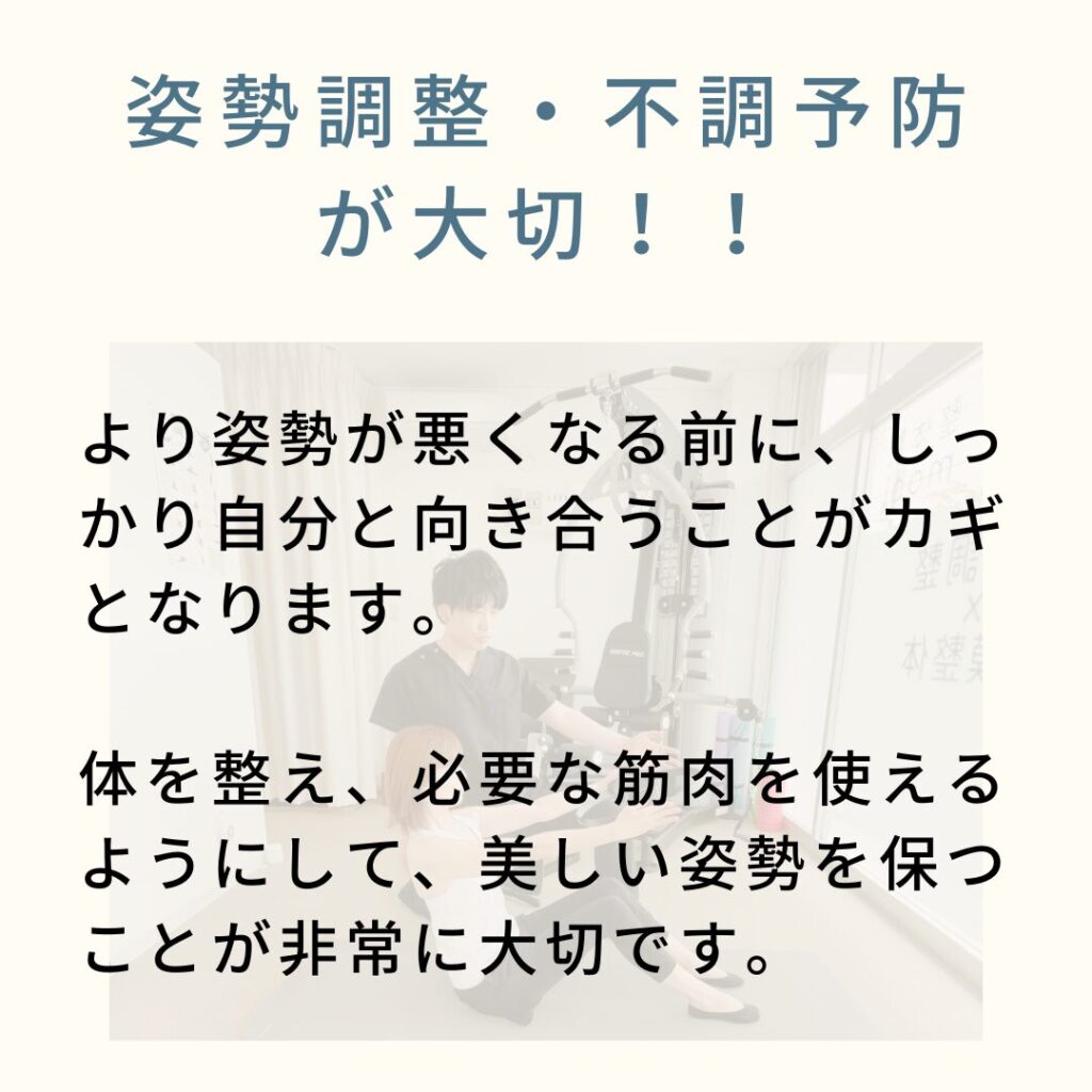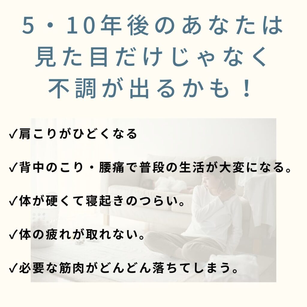 だから、≪将来の健康と体の不調予防≫のためにも、今から『体を鍛え、姿勢バランスを整える』ことが大切なのです。