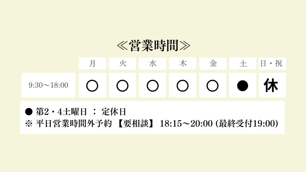 | 平日営業時間外予約 18:15~20:00 最終受付19:00まで | 別途 ➡2026/3/31まで 別途¥500- |